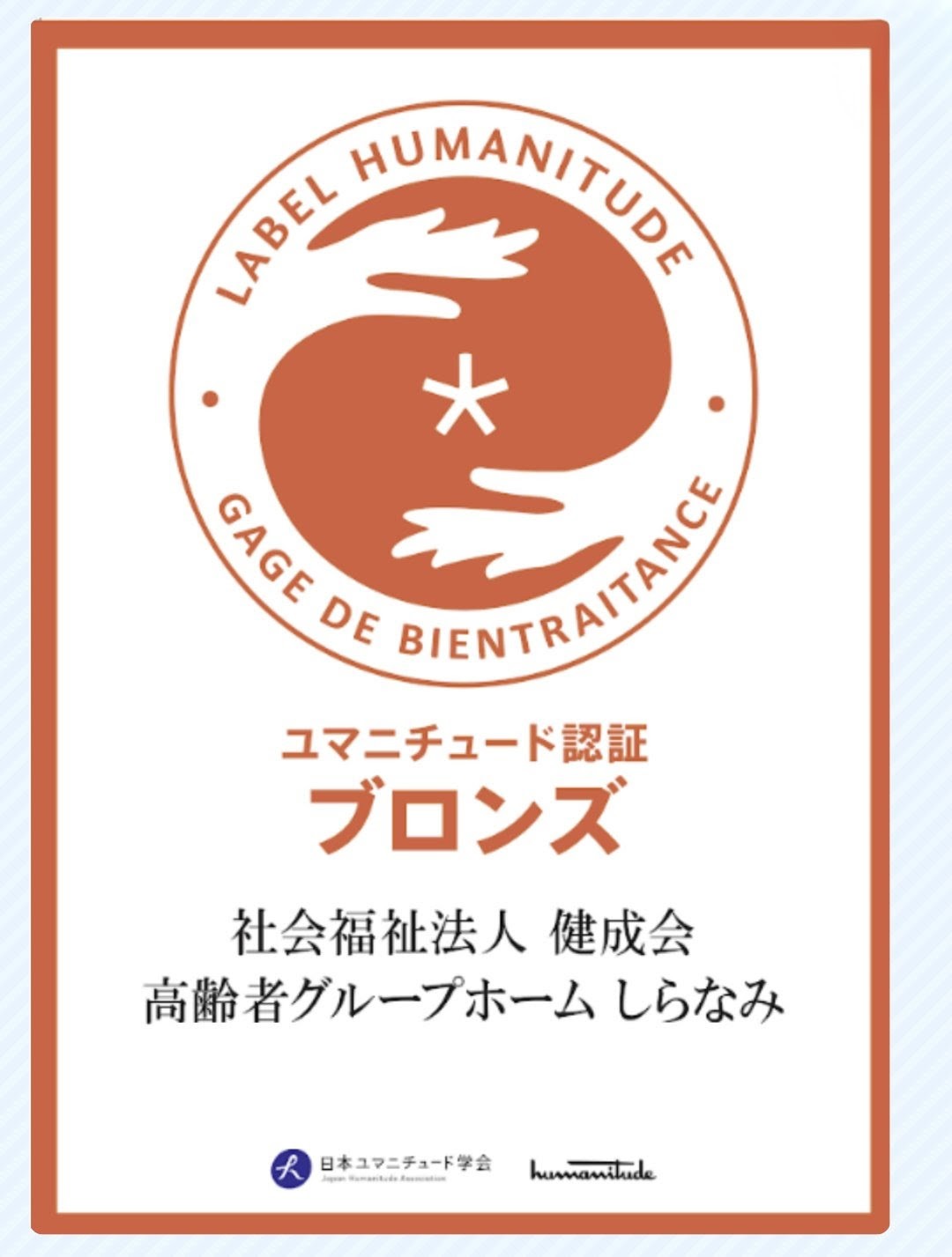 この認証は、ユマニチュードの理念を理解し、日々のケアの中で実践している施設であることを認めていただいた証です。